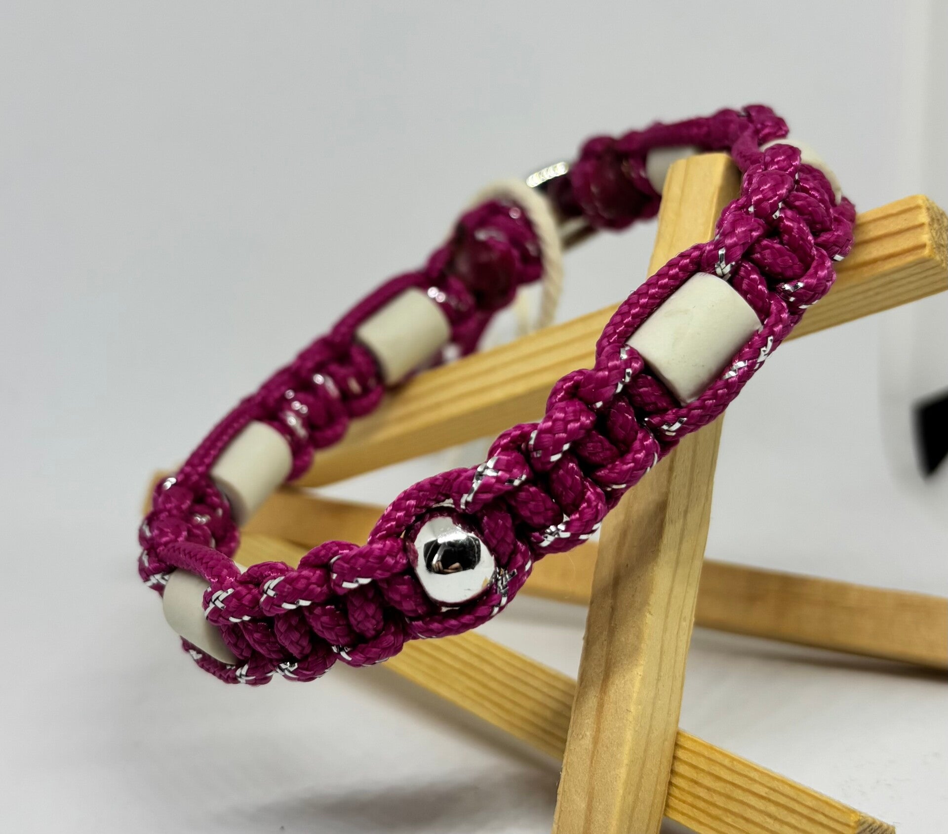 Handgefertigtes Halsband aus strapazierfähigem Paracord mit EM-Keramik-Pipes und stufenlos verstellbarem Kordelstopper. Es wird locker am Hals getragen und ist besonders in der Zecken- und Flohzeit ein beliebter natürlicher Begleiter.